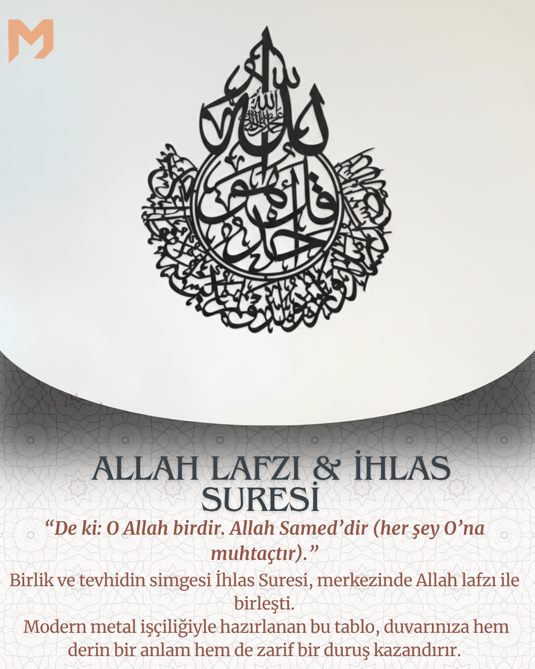 DUVAR DEKORU İÇİN TASARLANMIŞ İHLAS SURESİ VE ALLAH LAFZI DESENLİ METAL TABLO 8